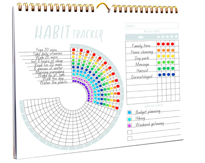 Stay accountable with a habit tracker planner that helps track your workout calendar, self care tracker and goal journal.